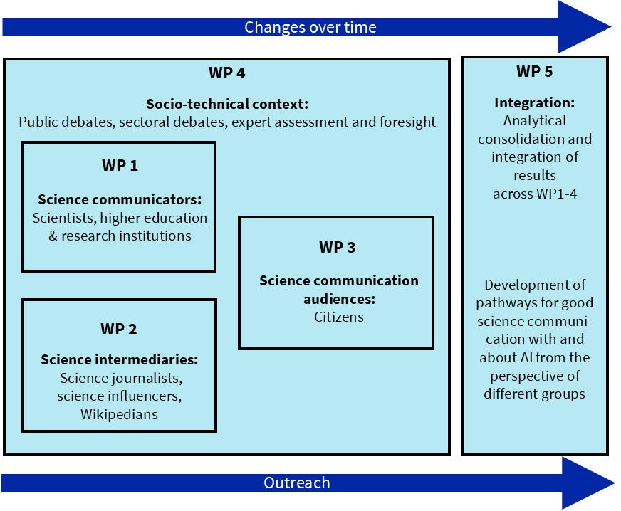 WP1: Wissenschaftskommunikator:innen: Wie nutzen Forschende und Kommunikationsabteilungen an Hochschulen KI für die Wissenschaftskommunikation – und warum (noch) nicht?WP2: Wissenschaftsvermittler:innen: Wie setzen Journalist:innen, Influencer:innen und Wikipedianer:innen KI in ihrer Vermittlung wissenschaftlicher Themen ein – etwa zum Schreiben, Recherchieren oder Visualisieren?WP3: Bürger:innen: Wie nutzen Menschen in der Schweiz KI, um sich über Wissenschaft zu informieren oder Inhalte selbst zu erstellen?WP4: Gesellschaftliche Debatten & Expert:innenwissen: Was wird in Medien und Fachkreisen über KI und Wissenschaftskommunikation diskutiert? Und wie bewerten Expert:innen aus Recht, Ethik, Technik und Kommunikation diese Entwicklungen?WP5: Ergebnisse bündeln & Handlungsperspektiven entwickeln: Wir bringen die Erkenntnisse zusammen, diskutieren sie mit der Praxis und entwickeln Empfehlungen für gute Wissenschaftskommunikation mit und über KI.Die Wiederholung dieser Untersuchungen über mehrere Jahre hinweg ermöglicht es zudem, Veränderungen im Zeitverlauf zu erfassen.